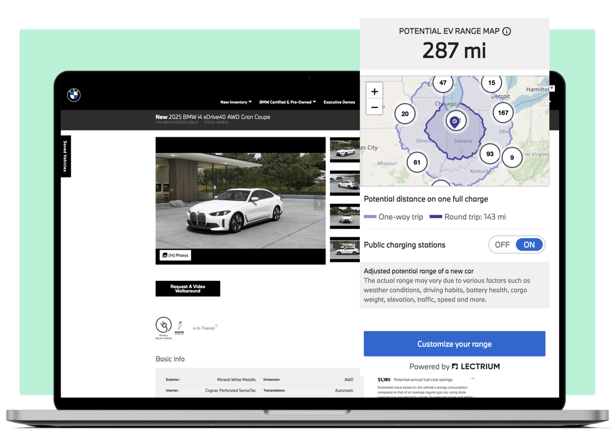 Improve the EV-buying experience by letting customers visualize personalized driving ranges and locate nearby fast-charging stations for every EV and PHEV in your inventory—all from your website.